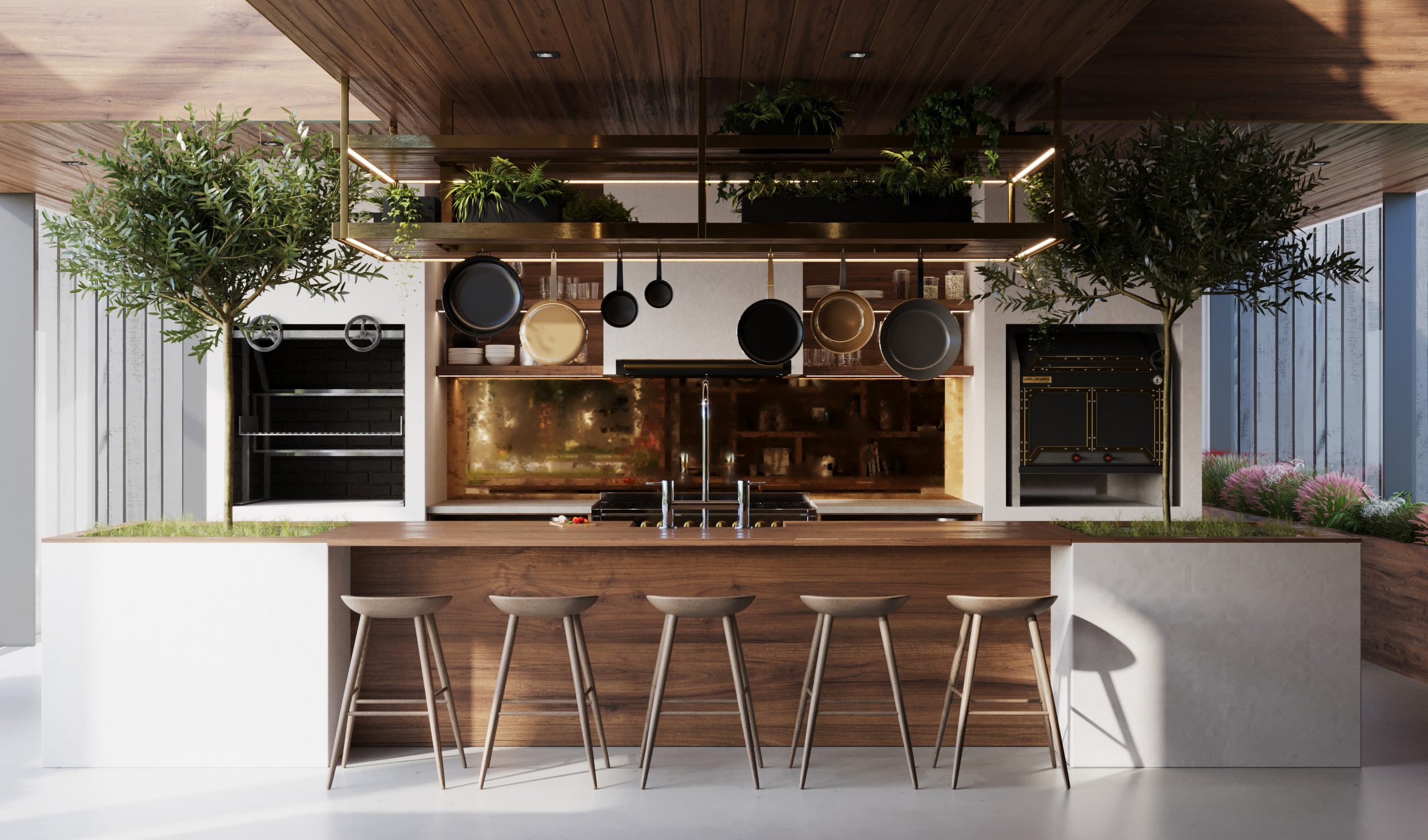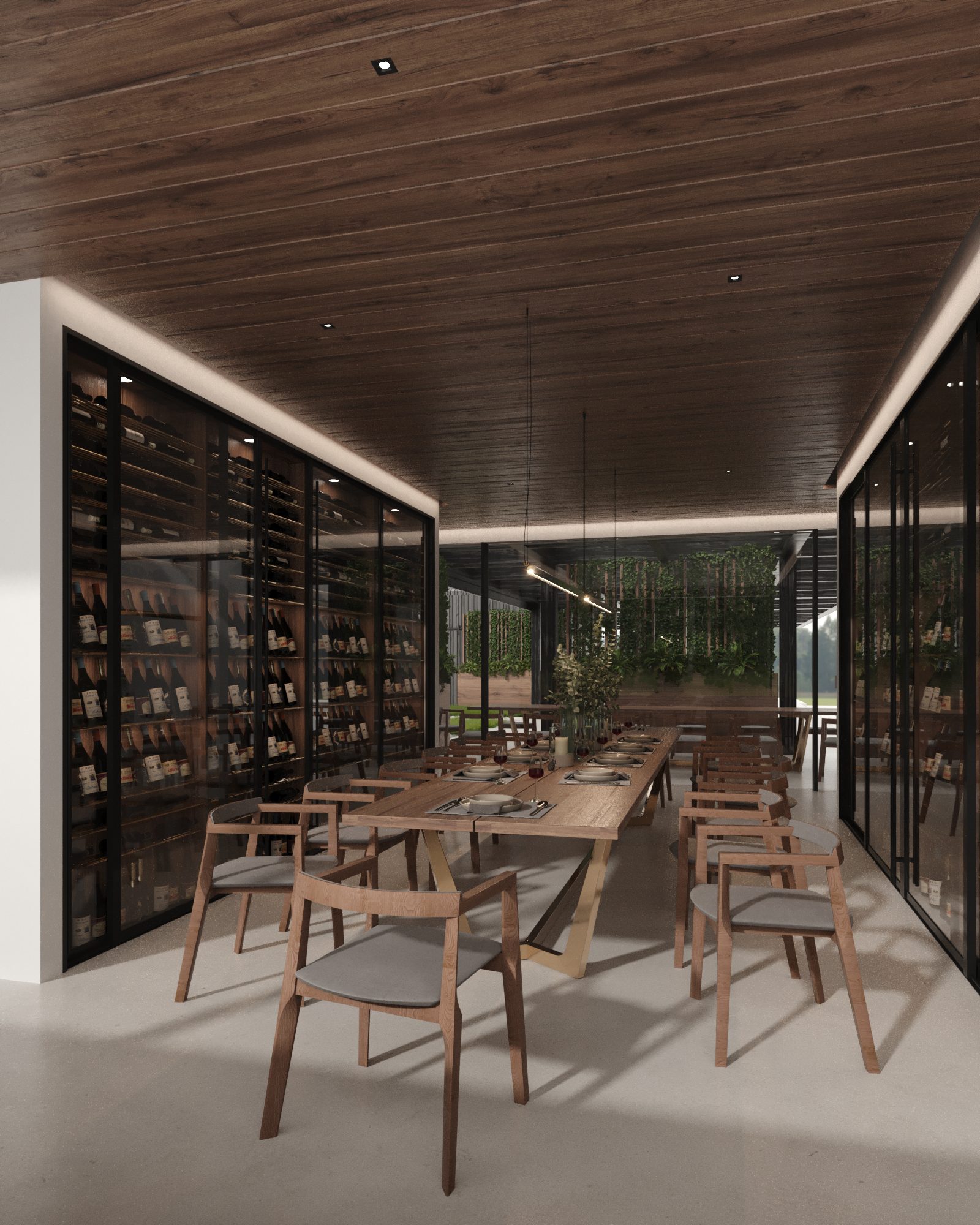 The overall style embraces a restrained, honest palette – wood and concrete form the core, refined with subtle brass accents that underscore the minimalist elegance of the residence.
