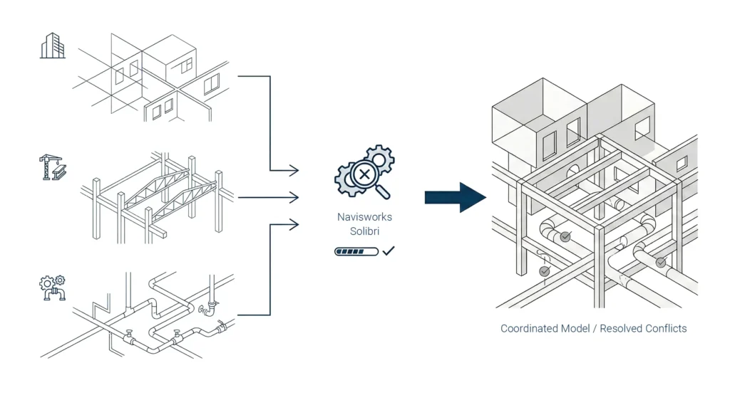 Most projects create “discipline models” (architecture, structure, mechanical, electrical, plumbing, fire protection). Clash detection starts by bringing all the models into one review environment and creating a coordinated model for checking spatial conflicts. That combined view makes it easier to detect clashes that no single team can see alone.