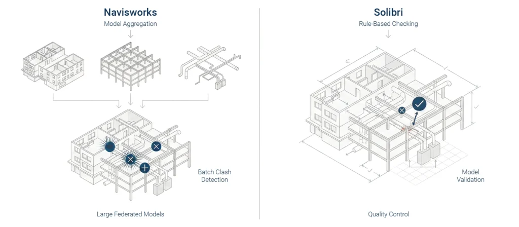 In commercial construction, Navisworks is often used for model aggregation, clash testing, and reviewing large federated models. Solibri is often used for rule-based checking and model quality reviews, depending on how teams structure clash detection rules and what outputs they need.