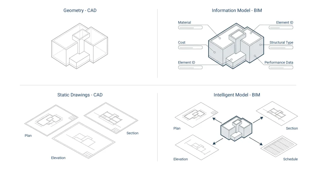 This distinction is central when comparing BIM and traditional drafting workflows.