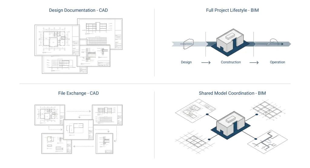 CAD focuses on drafting geometry, while BIM integrates geometry with structured information modeling for the entire project lifecycle.